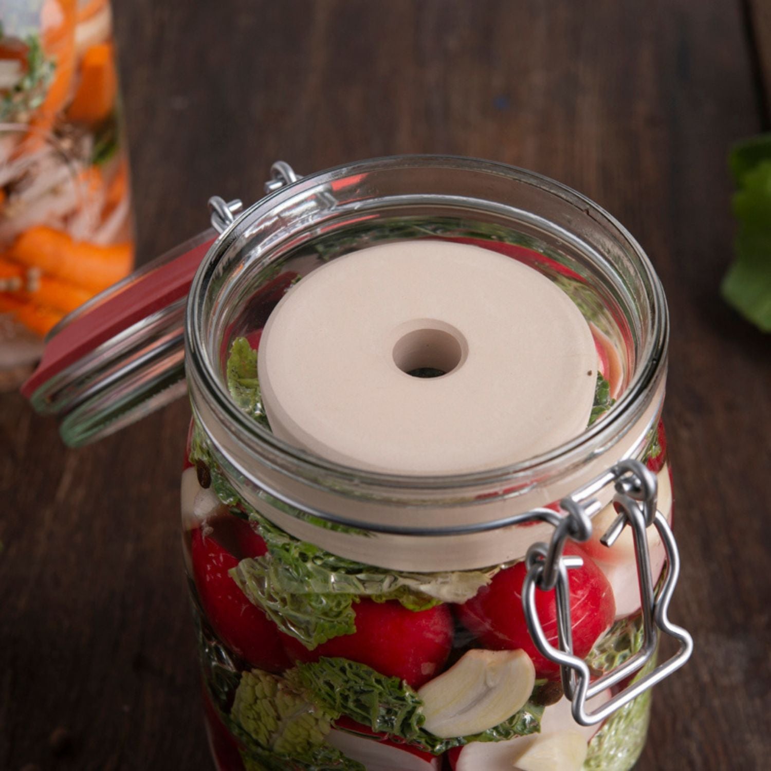 Unser Glas ist solide gefertigt und stammt aus deutscher Produktion. Der verzinkte Drahtbügel, sowie der Rote Gummiring lassen sich problemlos abnehmen und nach Verschleiß gegebenenfalls später einzeln ersetzen. Mit einem Gewicht des Beschwerungssteines von ca. 240g bleiben Ihre Fermente sicher unter der Flüssigkeit, was eine gleichmäßige Fermentation und optimale Ergebnisse sichert. In seiner Größe haben wir das Gewicht explizit an den Durchmesser der Öffnung des 0,8 Liter Glases angepasst.