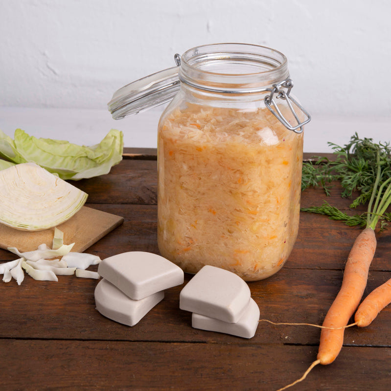 Unsere Steinzeugkeramik ist eine hochwertige Form der Keramik, die mit 1250°C bei einer wesentlich höherer Temperatur gebrannt ist, als viele andere keramischen Produkte, wie sie sie im Handel finden. Die hohe Brenntemperatur hat zur Folge, dass sich die Keramik “versintert”. Das bedeutet, dass sich die Poren der Keramik verschließen und ein glasähnliches Material entsteht, dass nahezu keine Feuchtigkeit mehr aufnehmen kann und somit auch keinen negativen Einfluss auf ihre Fermente hat. Die Versinterung der Keramik ermöglicht es uns, auf eine zusätzliche Glasur als Schutz der Keramik zu verzichten und diese stattdessen in seiner natürlichen Tonoberfläche zu belassen.